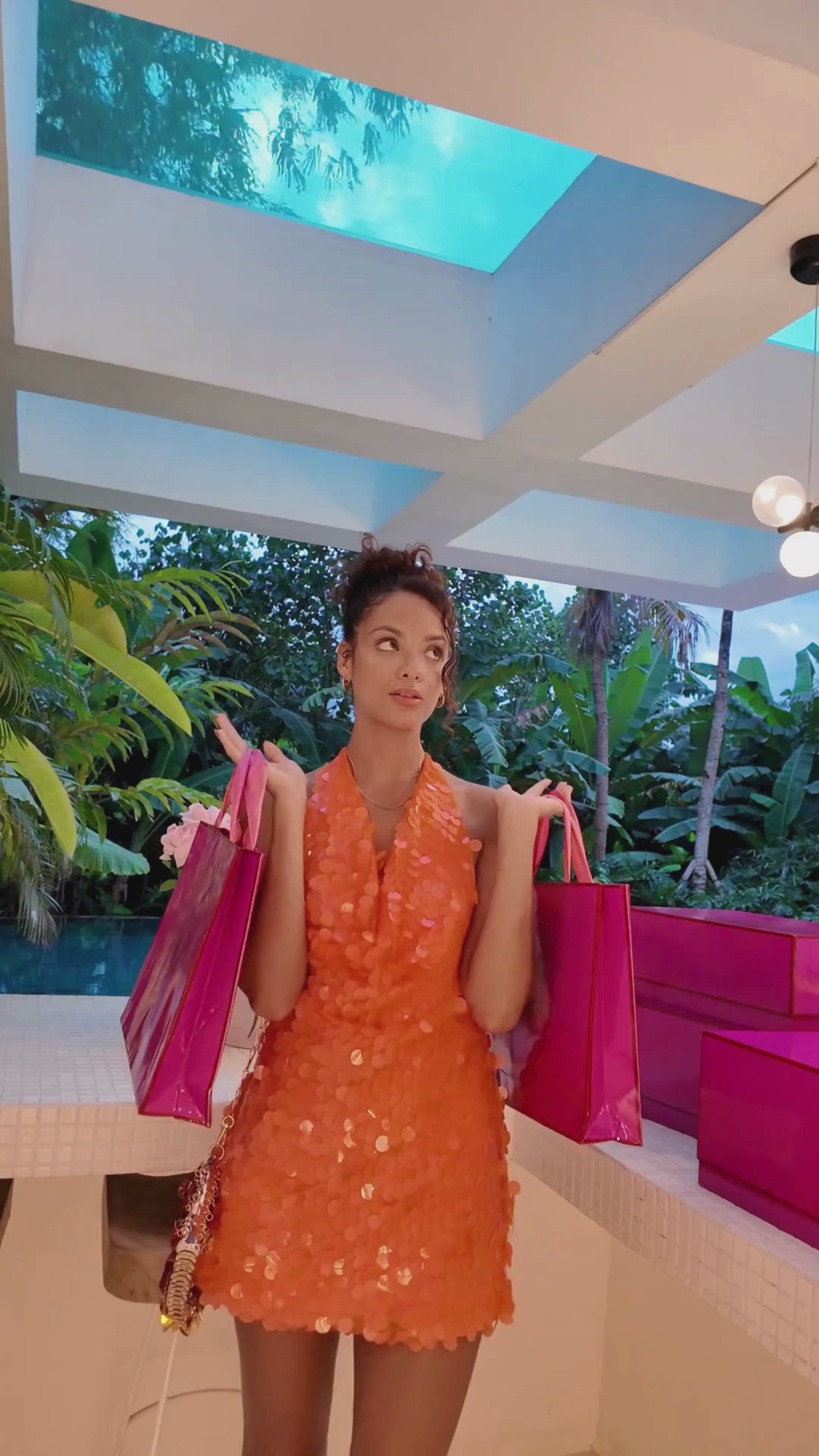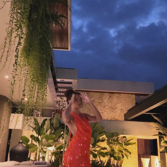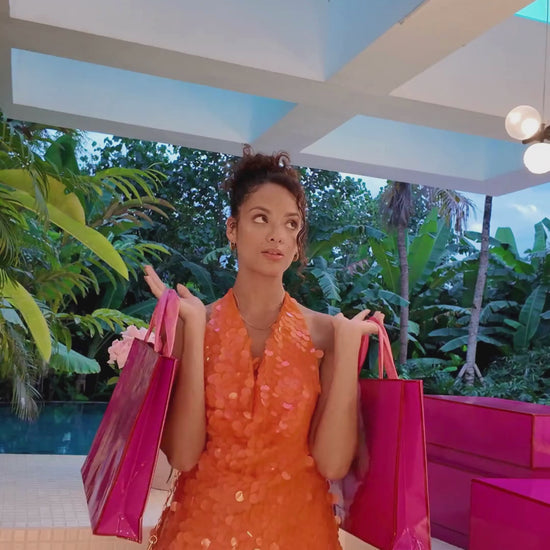 Shine brighter than the sunset in the Tangerine Crush Sequin Halter Mini Dress. Imagine slipping this on for a rooftop party, a dreamy holiday dinner, or a night of dancing by the beach. Its fiery orange sequins shimmer with every move, catching the light like golden hour waves.