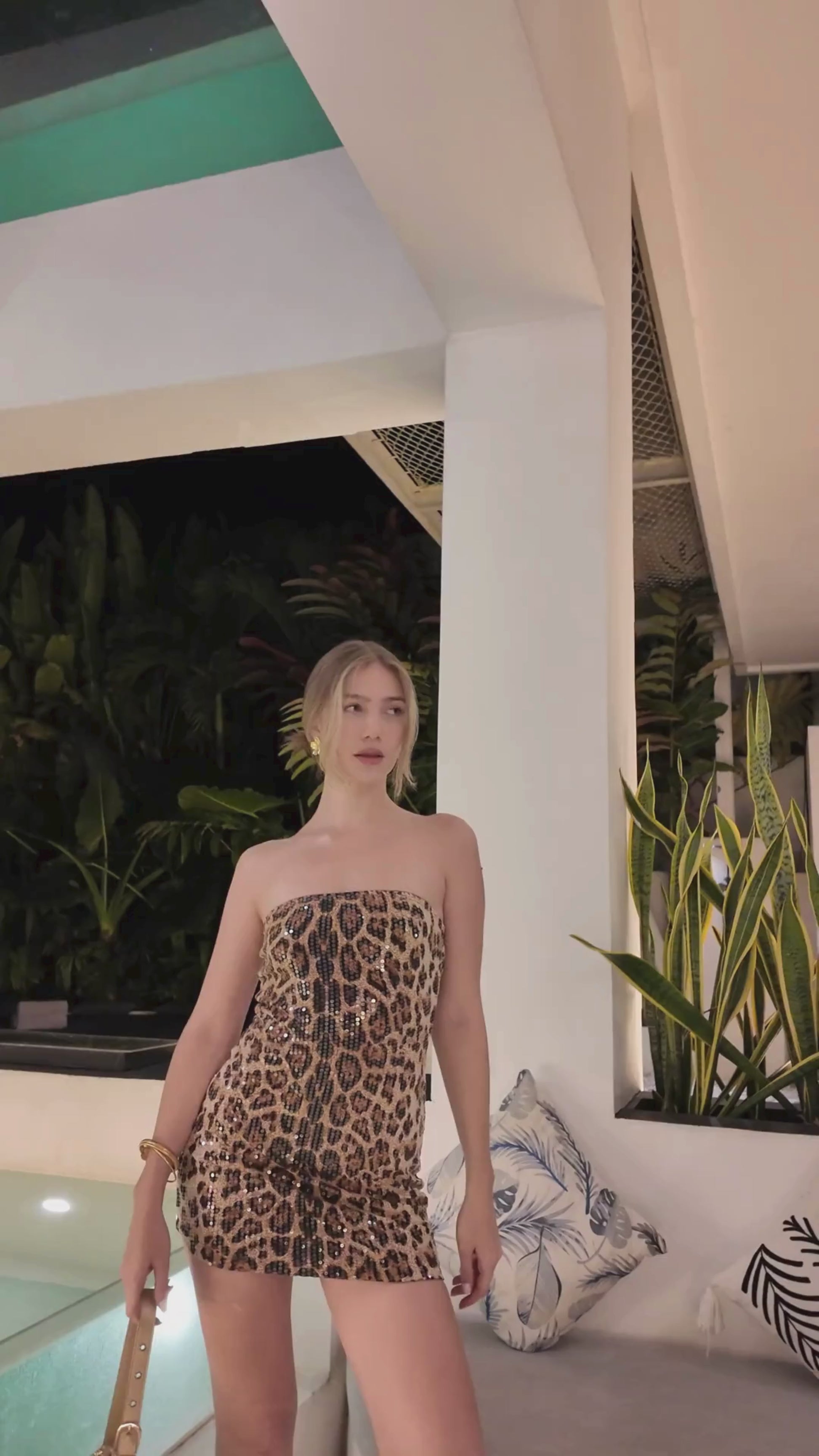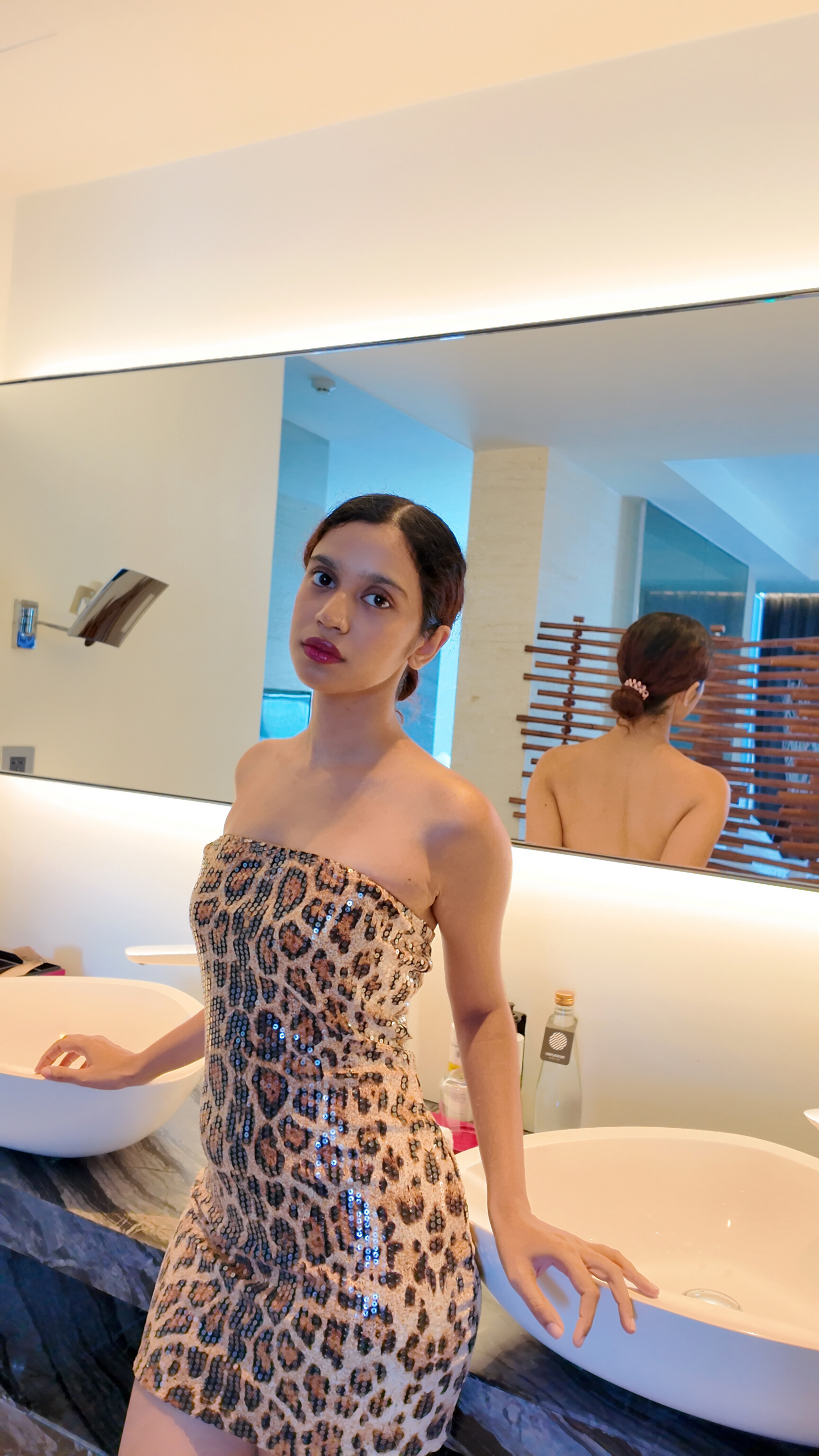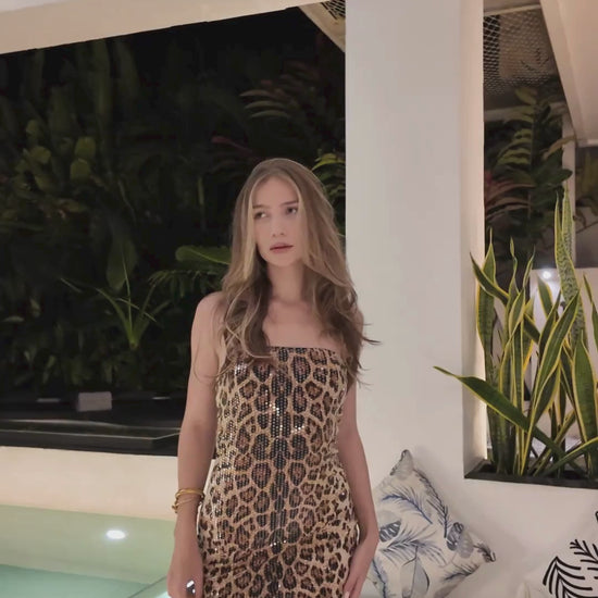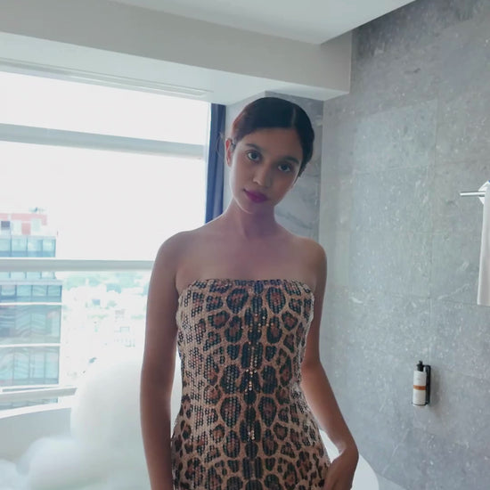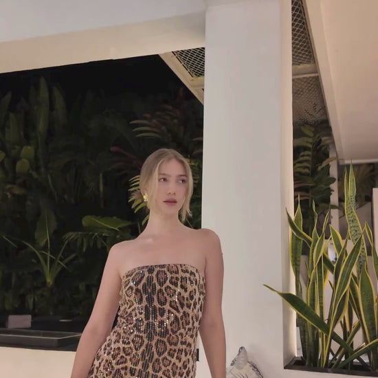 Step into your boldest self with the Feline Fantasy Strapless Mini Dress. This shimmering leopard-print dress is made to turn heads! Equal parts fierce and glamorous. Covered in sequins that catch the light with every move, it’s your go-to for nights when confidence is the only accessory you need.