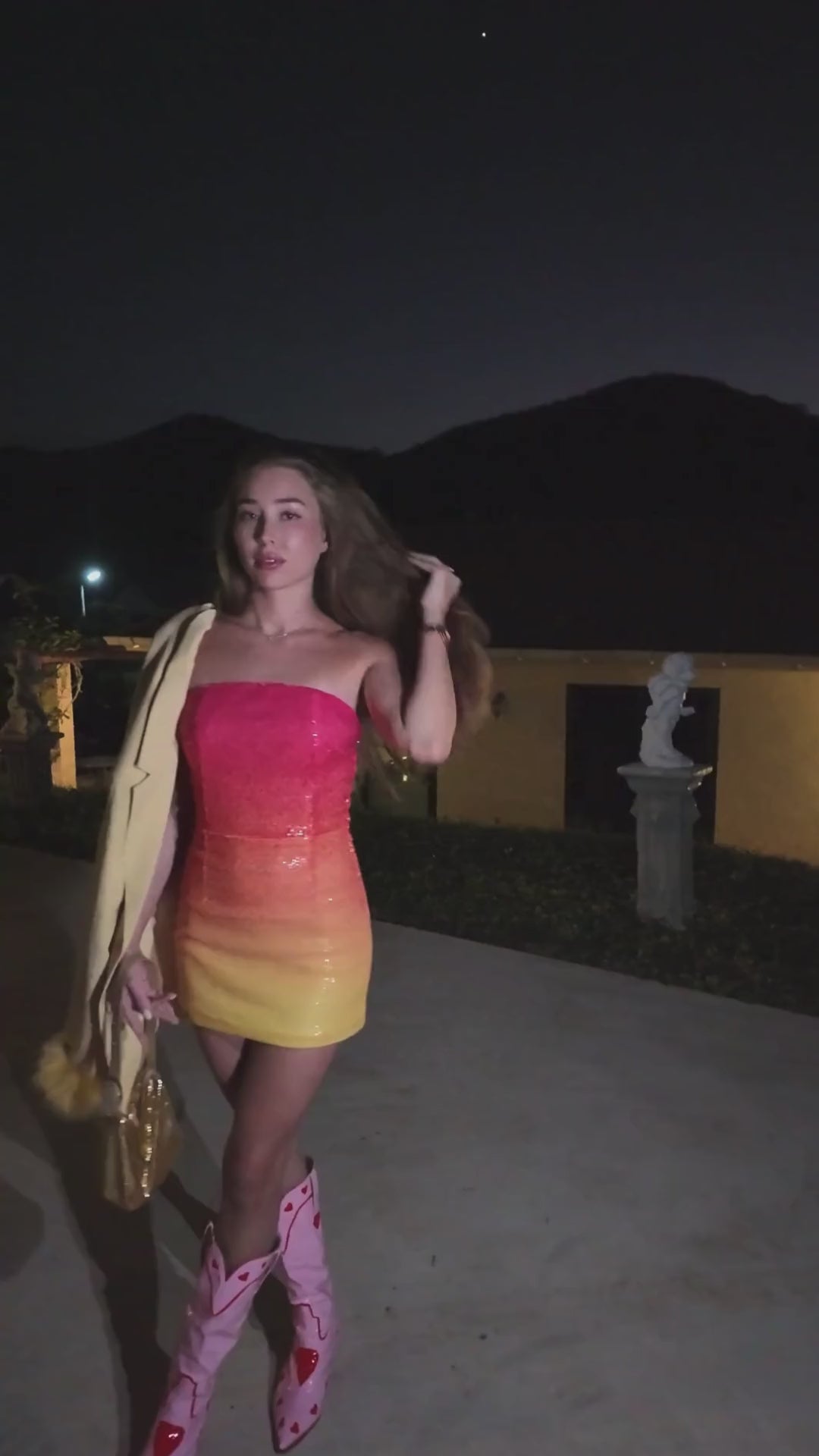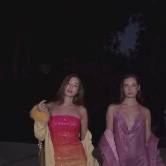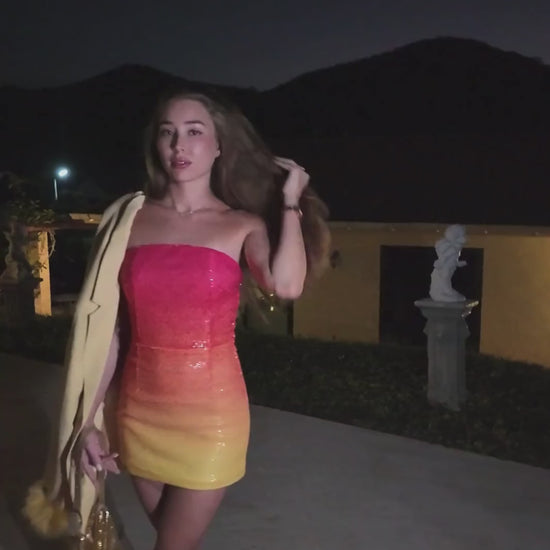 Step into a sunset dream with our Sunset Sparkle Mini Dress, a dazzling blend of bold and sweet hues. The dress features a mesmerizing ombré effect, transitioning from a fiery coral pink at the bust to a radiant golden yellow at the hem, reminiscent of the sky during a perfect sunset. The shimmering sequin fabric adds a touch of sparkle, ensuring you shine wherever you go. This dress is perfect for evening soirées, date nights, or any moment you want to turn heads.